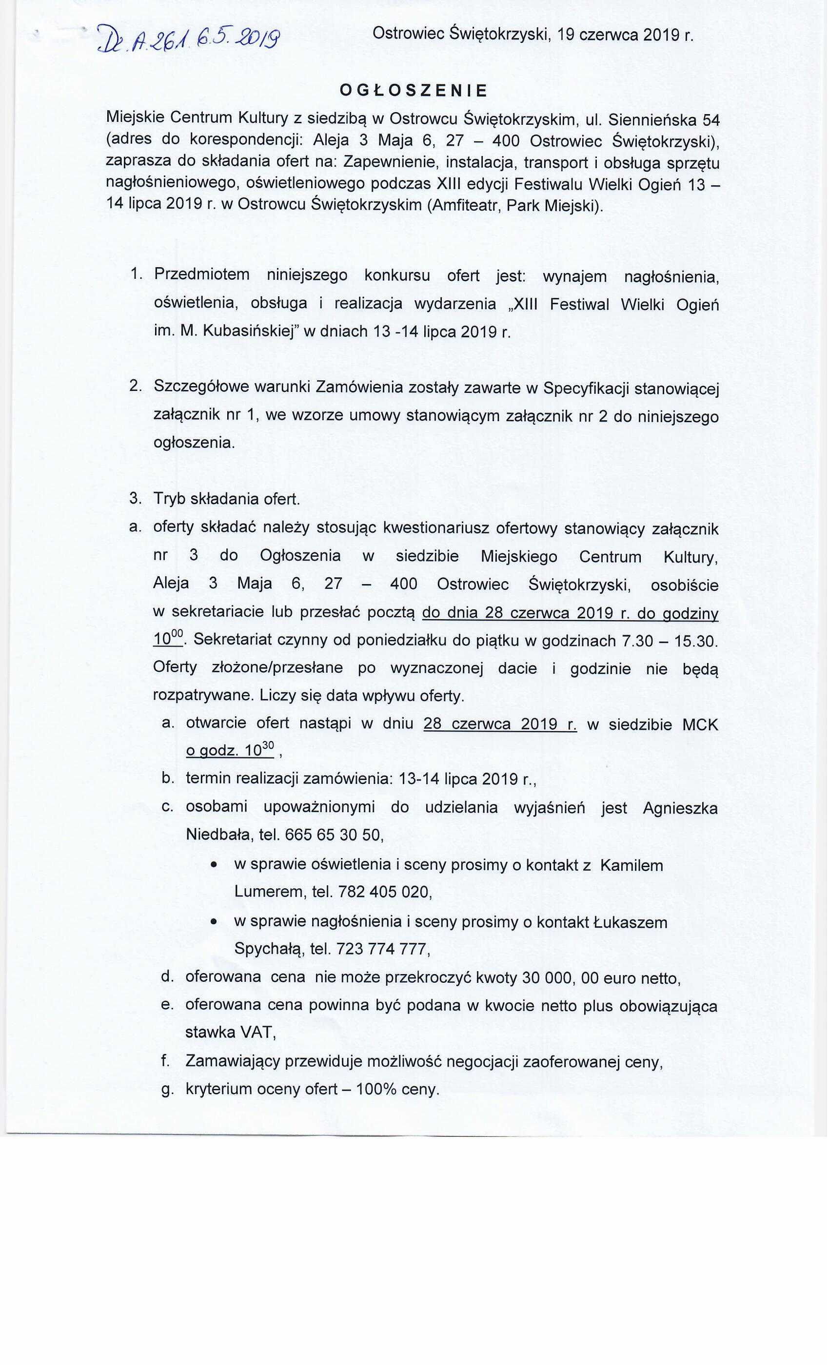 Miejskie Centrum Kultury zaprasza do składania ofert na: "Zapewnienie, instalacja, transport obsługa sprzętu nagłośnieniowego i oświetleniowego podczas XIII edycji Festiwalu Wielki Ogień 13 - 14 lipca 2019 r. w Ostrowcu Świętokrzyskim."